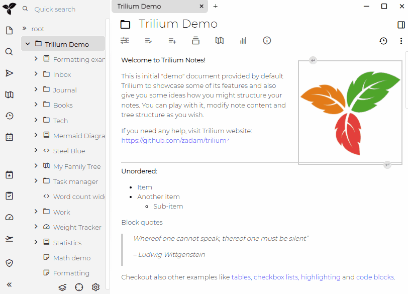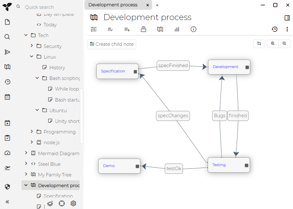 map上的项-”Specification”,“Development”,“Testing” 和”Demo”实际上是在”开发过程”笔记下创建的笔记-您可以单击它们并写一些内容。笔记之间的连接称为关系。